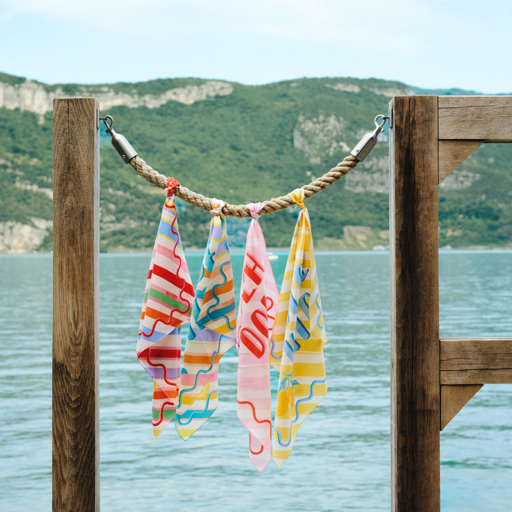 De Capri à Positano, de Marrakech à Rio, la collection nous entraîne dans un voyage entre paysages méditerranéens, villes vibrantes et jardins luxuriants. Chaque foulard devient un souvenir ou une promesse d’évasion. Couleurs lumineuses, motifs généreux et compositions riches en détails capturent l’esprit des vacances : la légèreté, la découverte et la joie simple de prendre le temps.