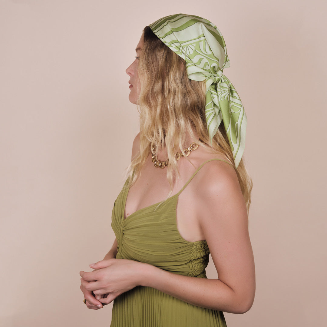 The silk bandana: A small square for a beautiful effect. The Malfroy bandana is an accessory that allows you to unleash your creativity. Its size allows for multiple ways to wear it: tied around your neck, attached to your bag, or as a headscarf, it adapts to all your desires.