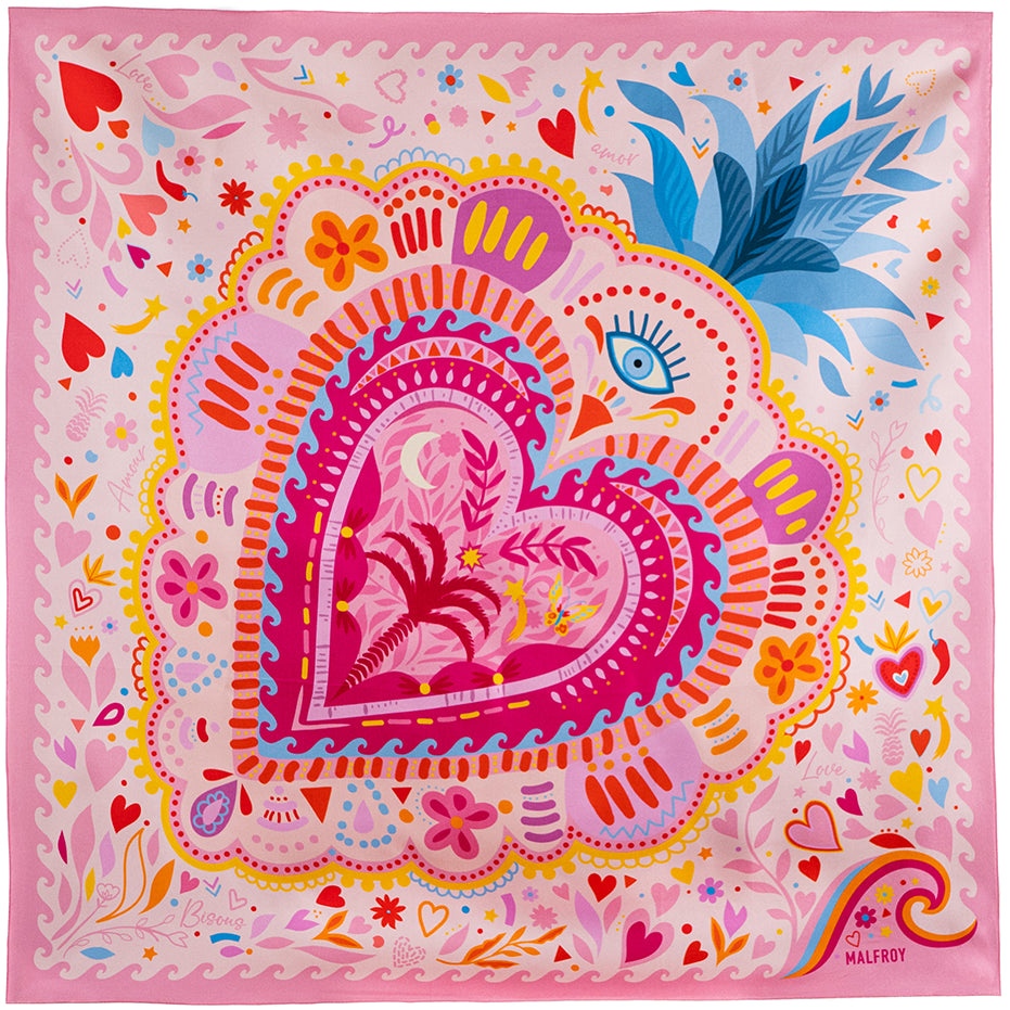 This silk square is an ode to love. It depicts a Mexican ex-voto heart symbolizing a vow or gratitude. Little love notes, confetti, and other naïve-style drawings adorn this scarf. At the center of the heart, a landscape promises escape. This scarf is the perfect gift for a loved one.