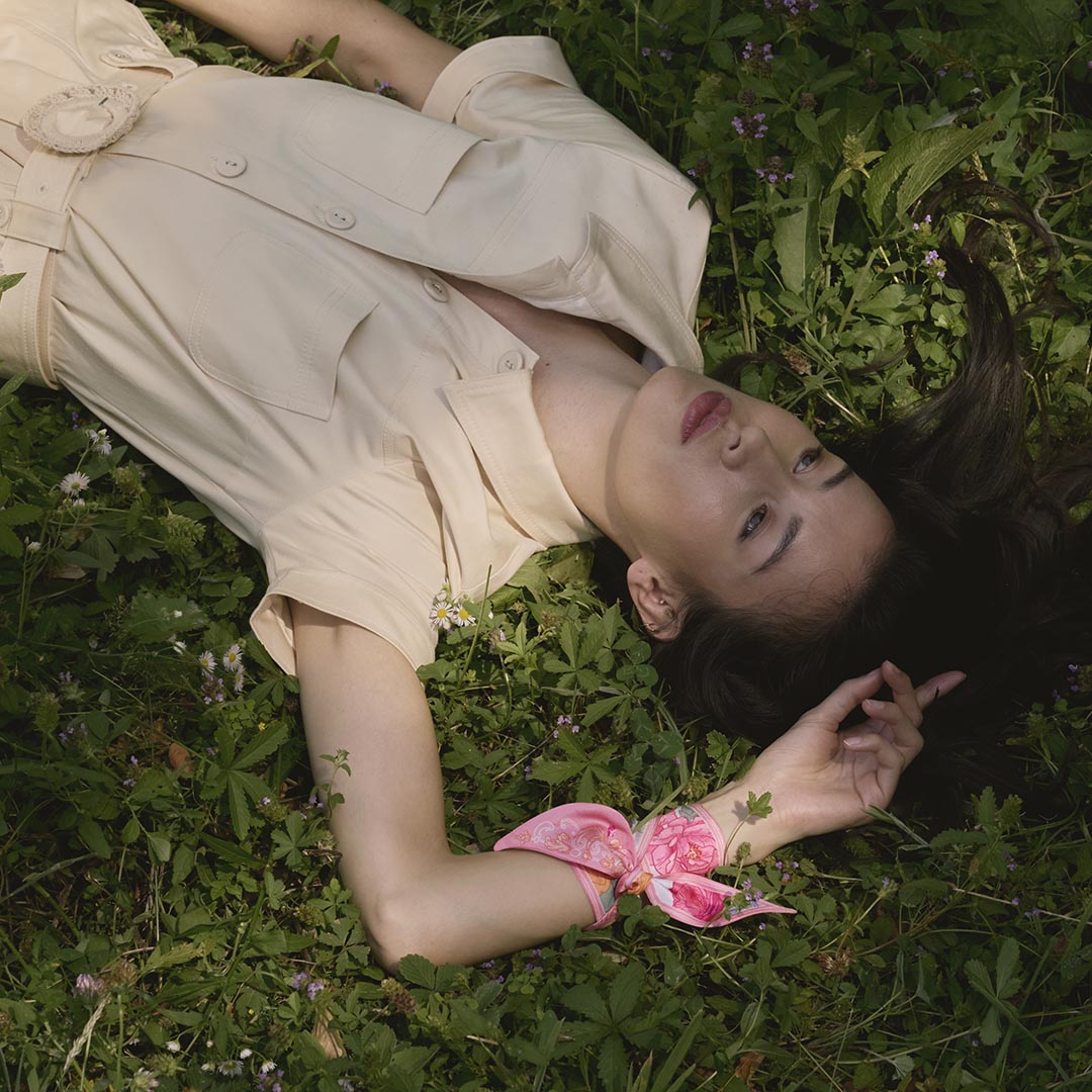 Son petit format, comme un ruban de soie, permet de le porter en bracelet, dans les cheveux, à la ceinture ou sur un sac. A vous la fantaisie !