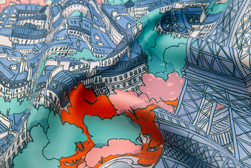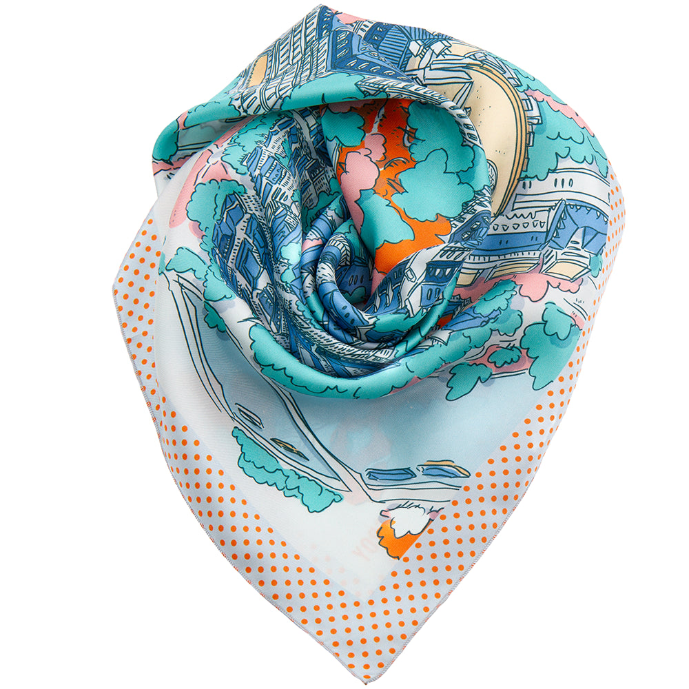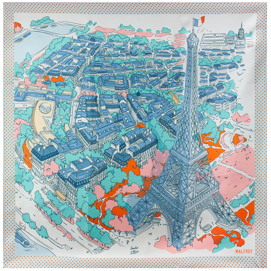 Chaque ligne de ce carré de soie est entièrement dessinée à la main avec passion, chaque couleur a été soigneusement choisie pour vous égayer, le tout nous offrant un nouveau point de vue aérien sur notre belle et fière capitale