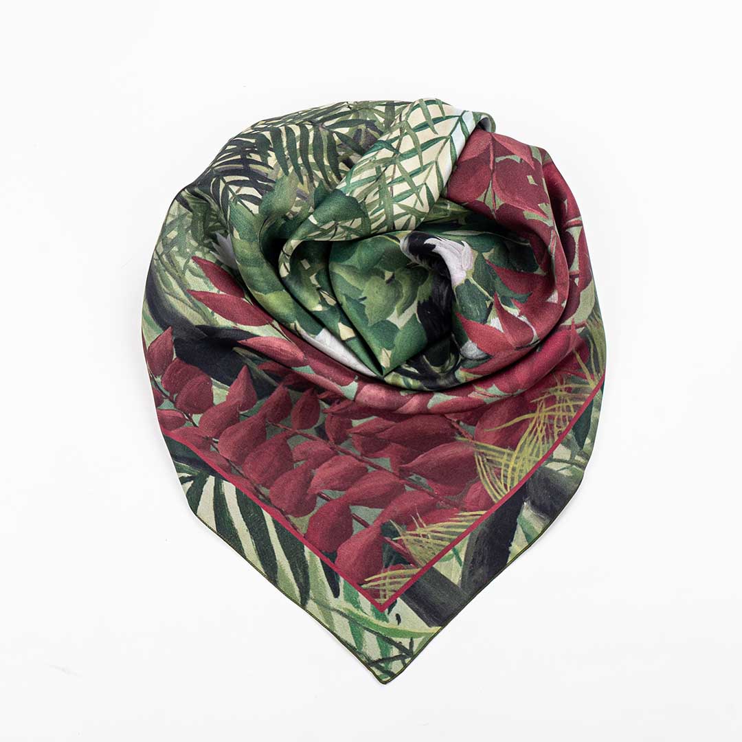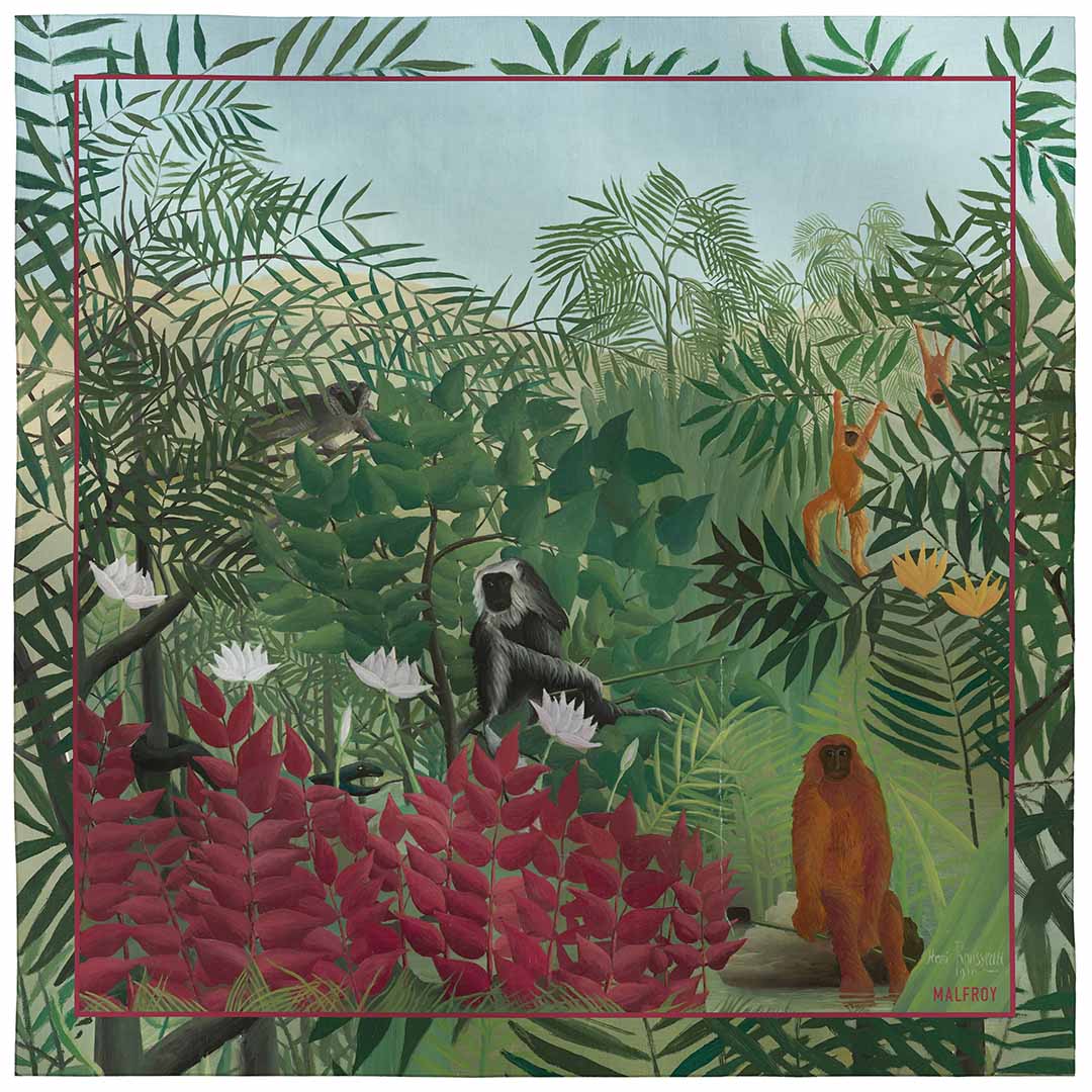 Pour ce carré de soie nous avons choisi de représenter le tableau emblématique Forêt tropicale avec des singes du Douanier Rousseau, artiste autodidacte et figure singulière de l’art naïf.
