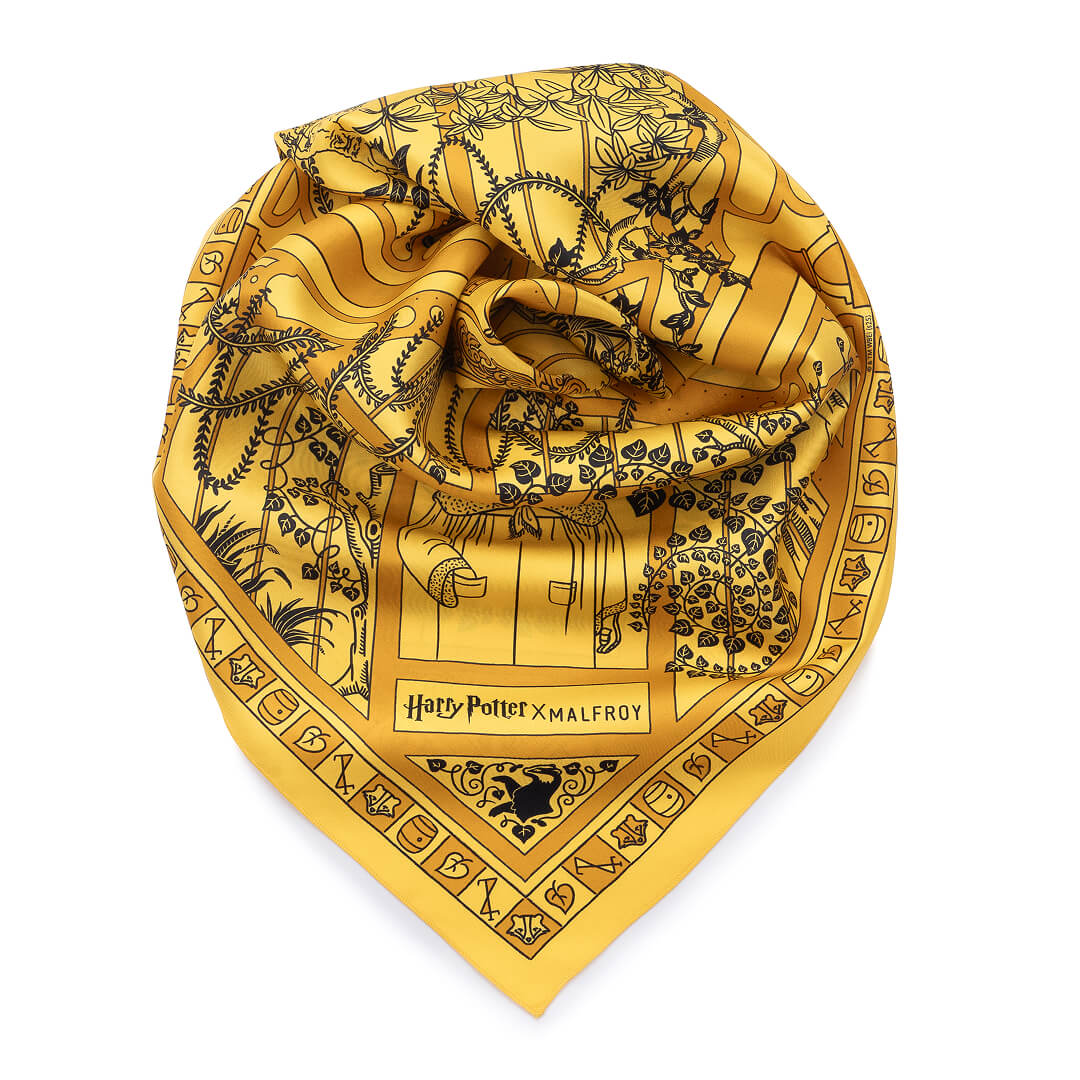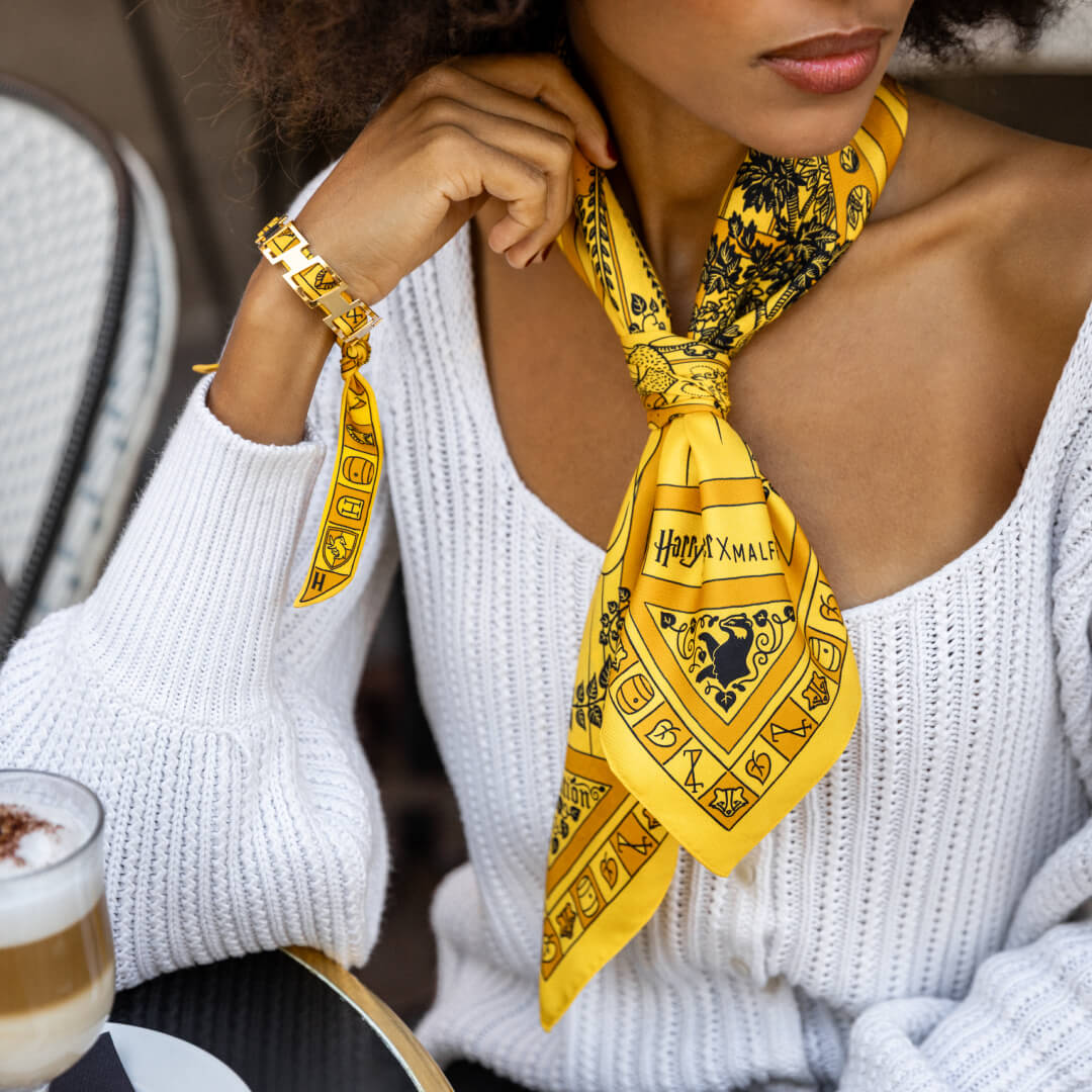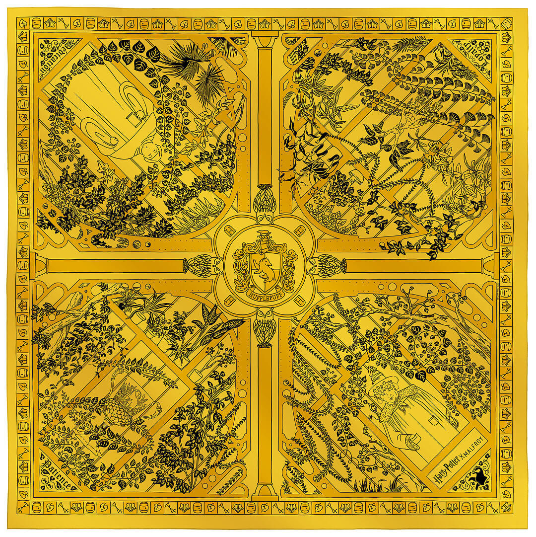 Les qualités qui définissent un élève Poufsouffle y sont écrites à l'encre noire faisant de ce foulard un étendard élégant et discret aux couleurs de leur maison