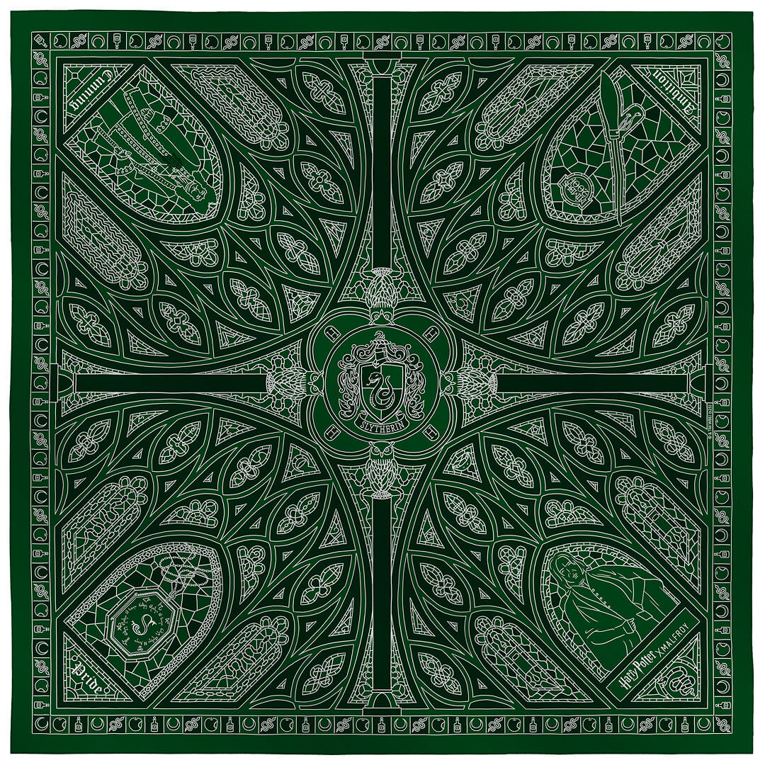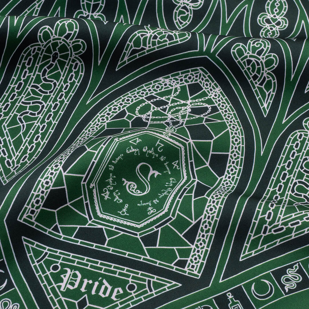 Les qualités qui définissent un élève Serpentard y sont écrites en lettres d'argent faisant de ce foulard un étendard élégant et discret aux couleurs de leur maison.