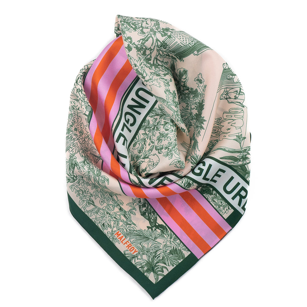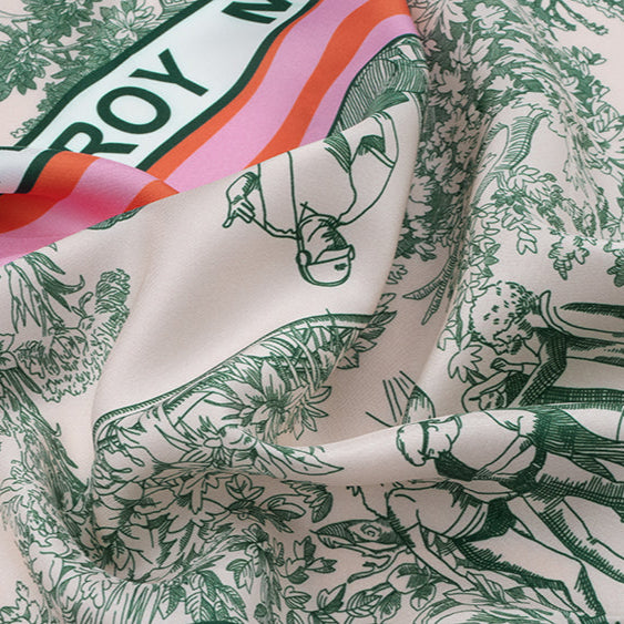 Pour ce foulard en soie, nos dessinatrices ont détourné le motif de la toile de Jouy.