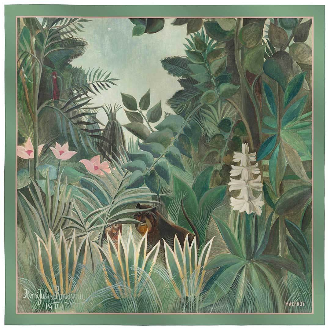 Notre carré en soie reproduit le tableau La jungle équatoriale du Douanier Rousseau, qui illustre parfaitement son style unique d’art naïf.
