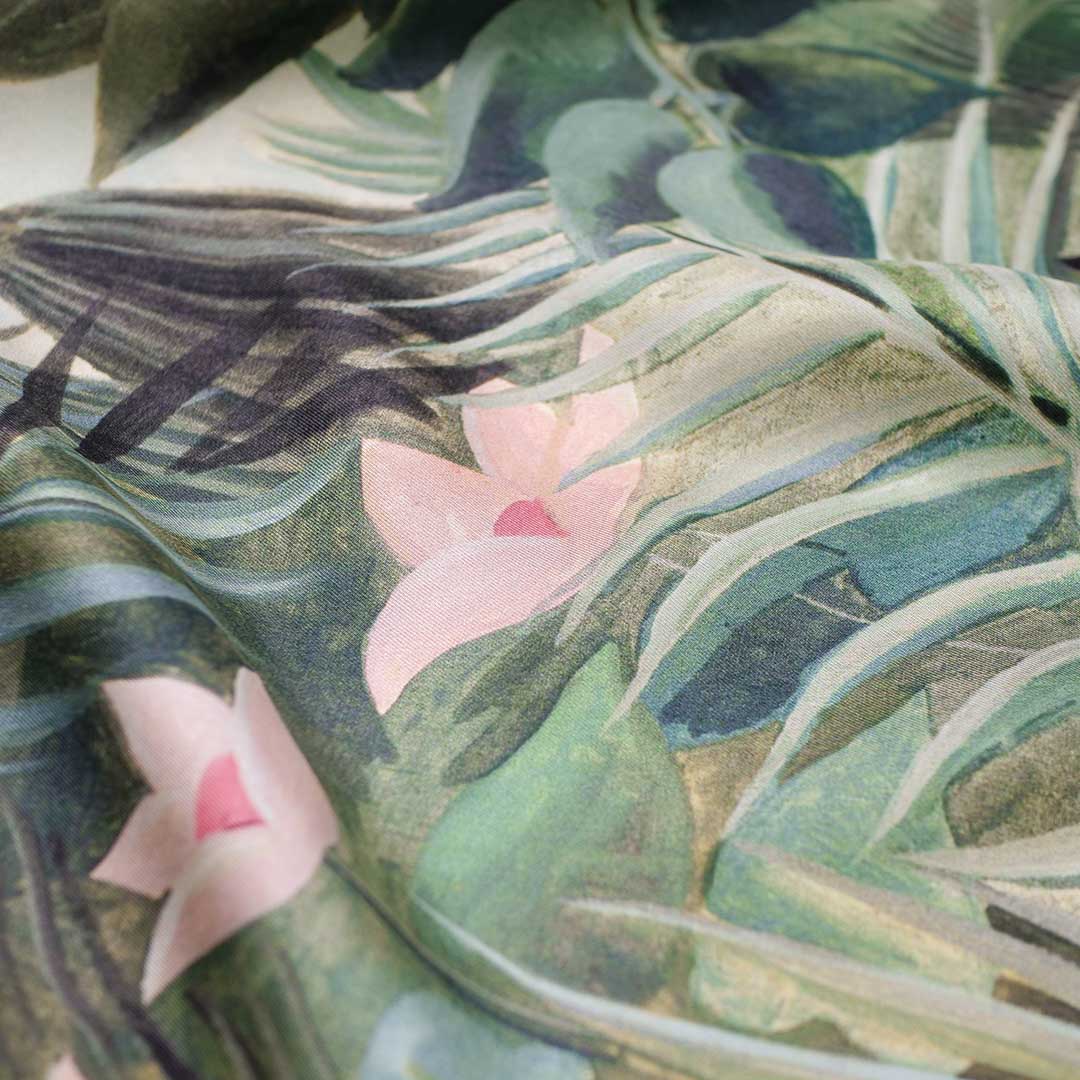 Transposé sur soie les traits précis et les contours nets s’animent au gré des mouvements du tissu, donnant vie à cette jungle imaginaire avec fluidité et légèreté.