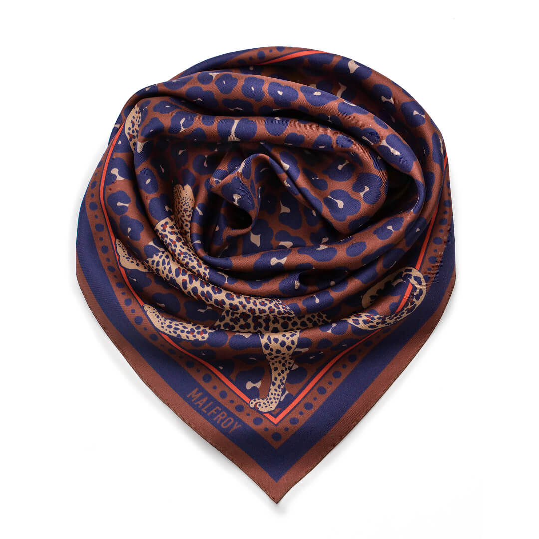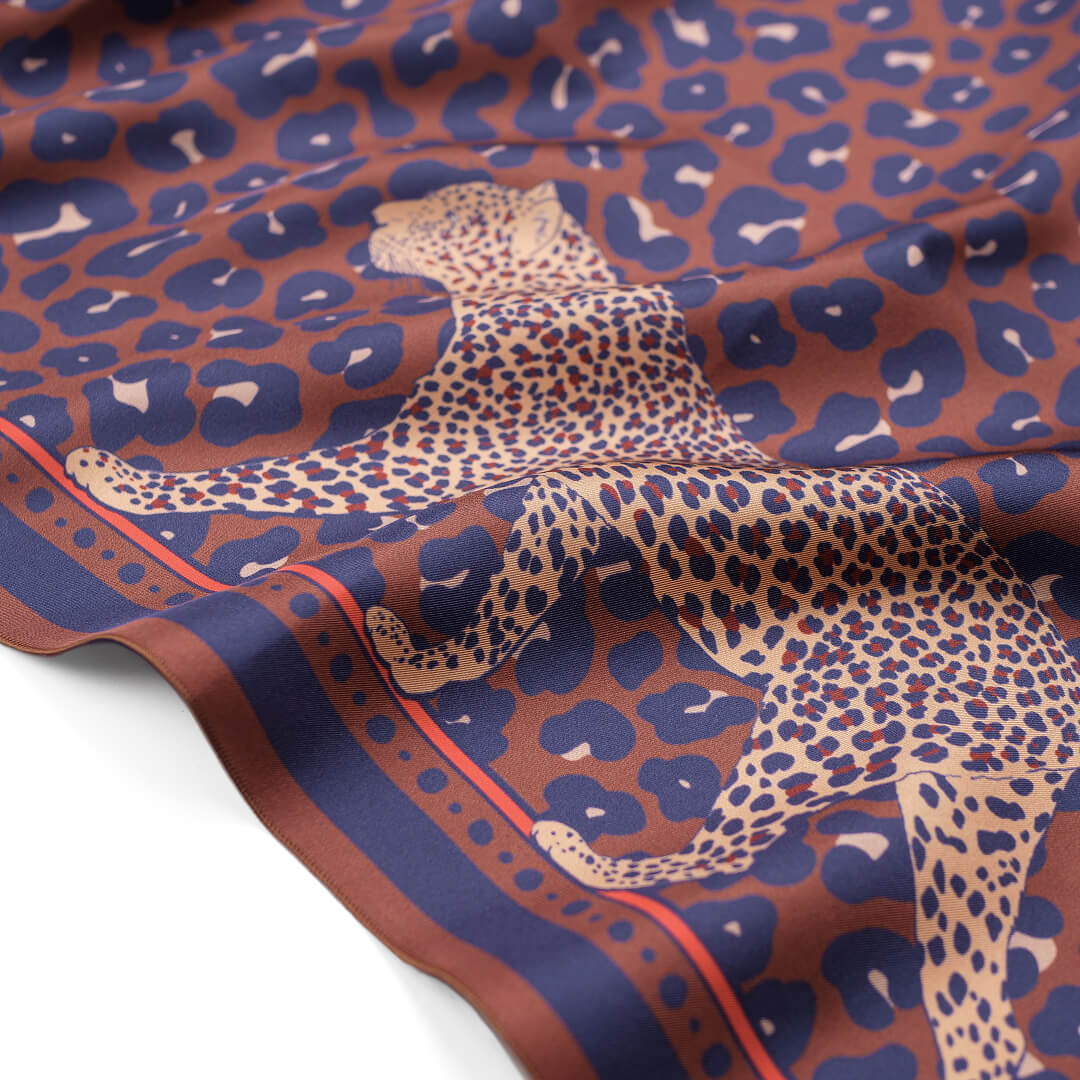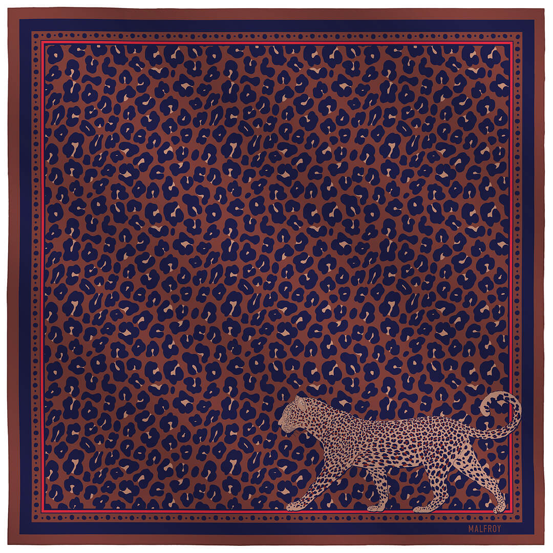 Le motif se déploie avec grâce sur l’ensemble du foulard, tandis qu’un léopard stylisé arpente délicatement les bords, ajoutant une note de raffinement à cette pièce iconique.