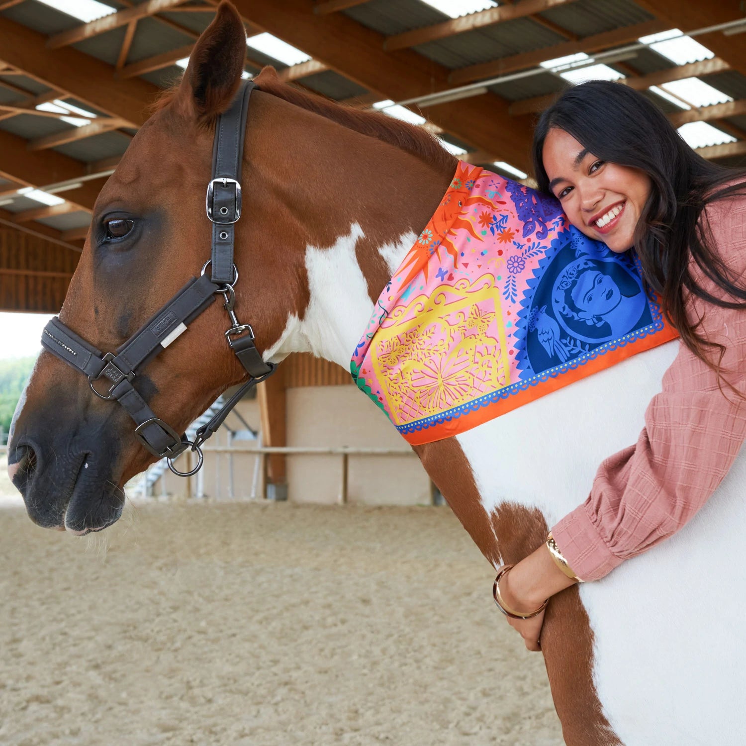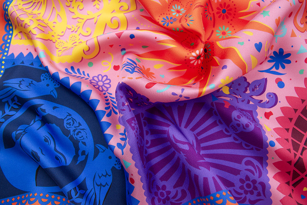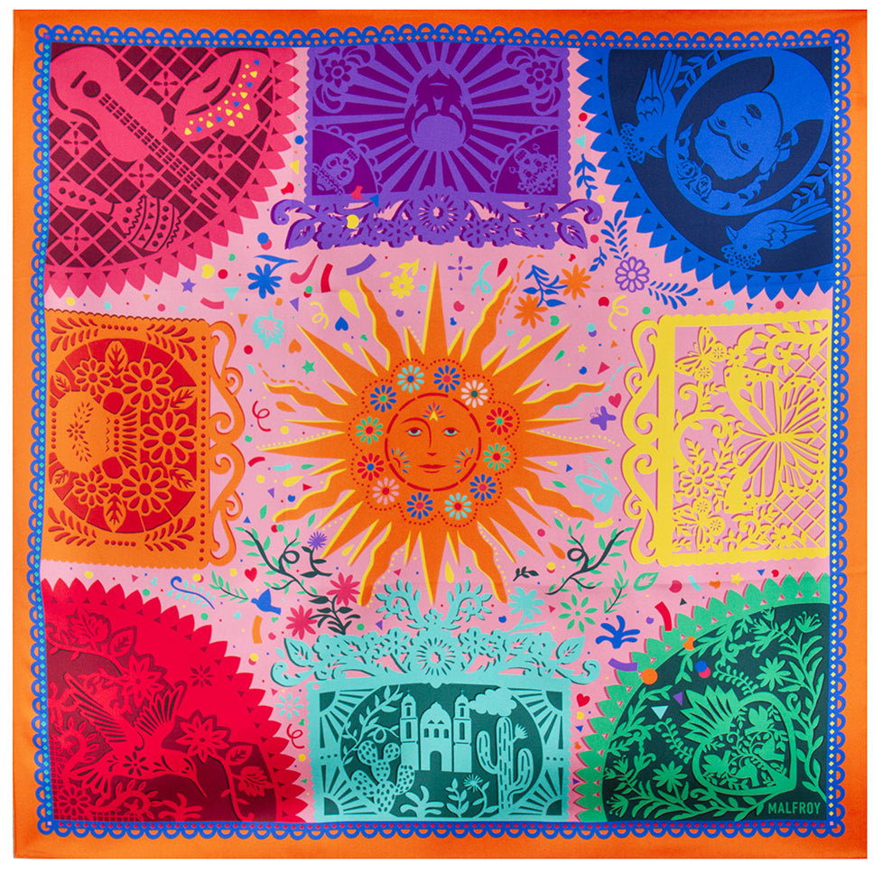 Chaque papel picado de ce carré représente un élément fort de la culture mexicaine, tel que la lucha libre, l’artiste Frida Kahlo, la musique, la nature luxuriante et l’amour.