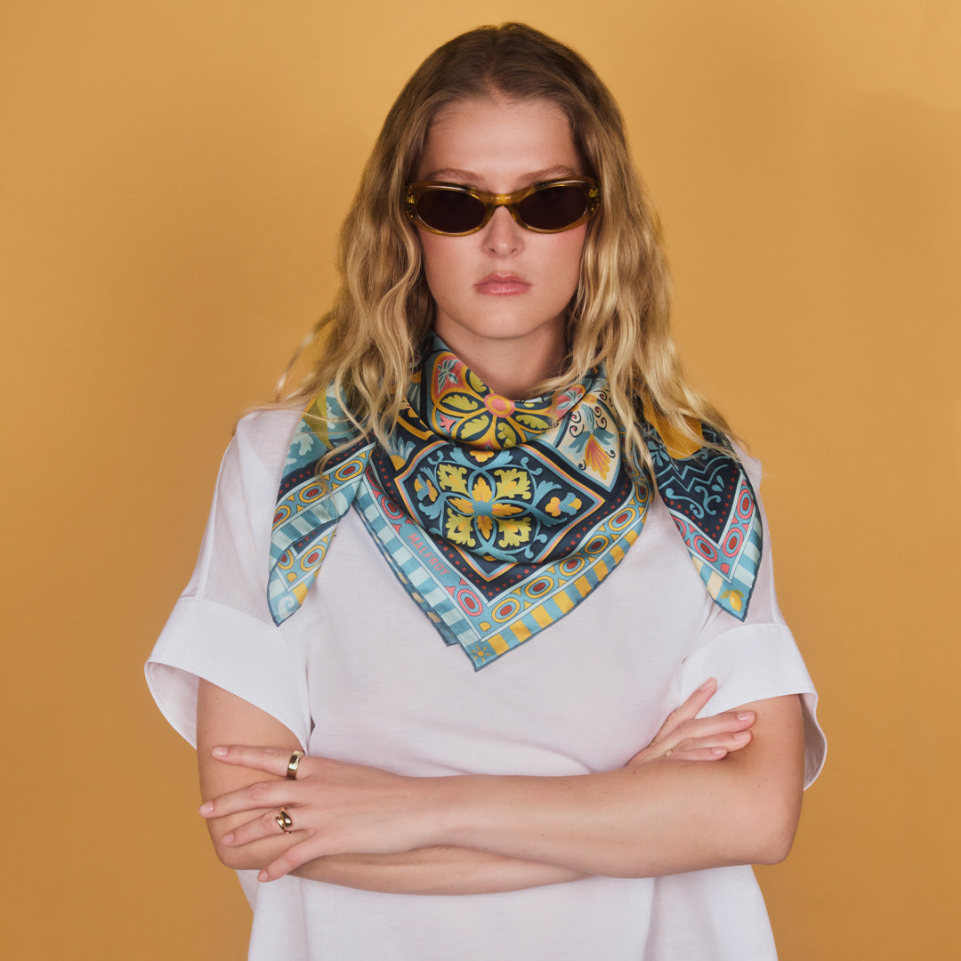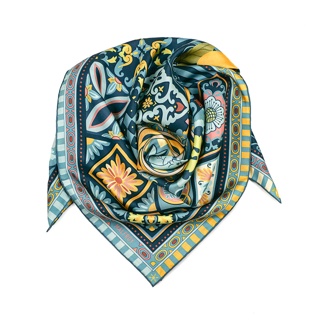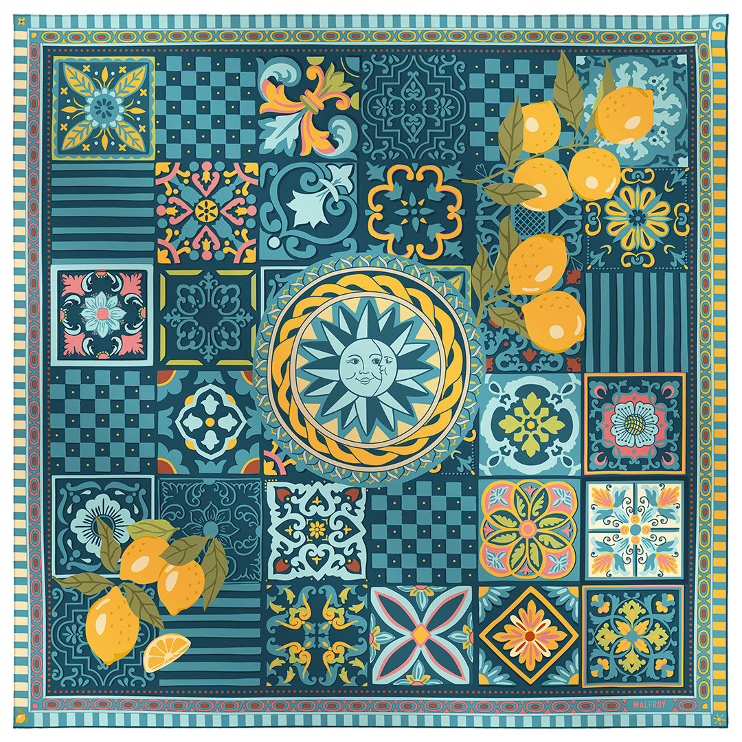 Ce carré de soie s’inspire de la richesse et du raffinement de l’artisanat céramique de la côte amalfitaine. Ce délicat méli-mélo de carreaux aux motifs traditionnels est sublimé par la présence des célèbres citrons de la région, emblèmes de fraîcheur et de lumière. En portant ce carré, vous serez transporté au cœur de la dolce vita italienne, entre douceur de vivre et soleil méditerranéen.