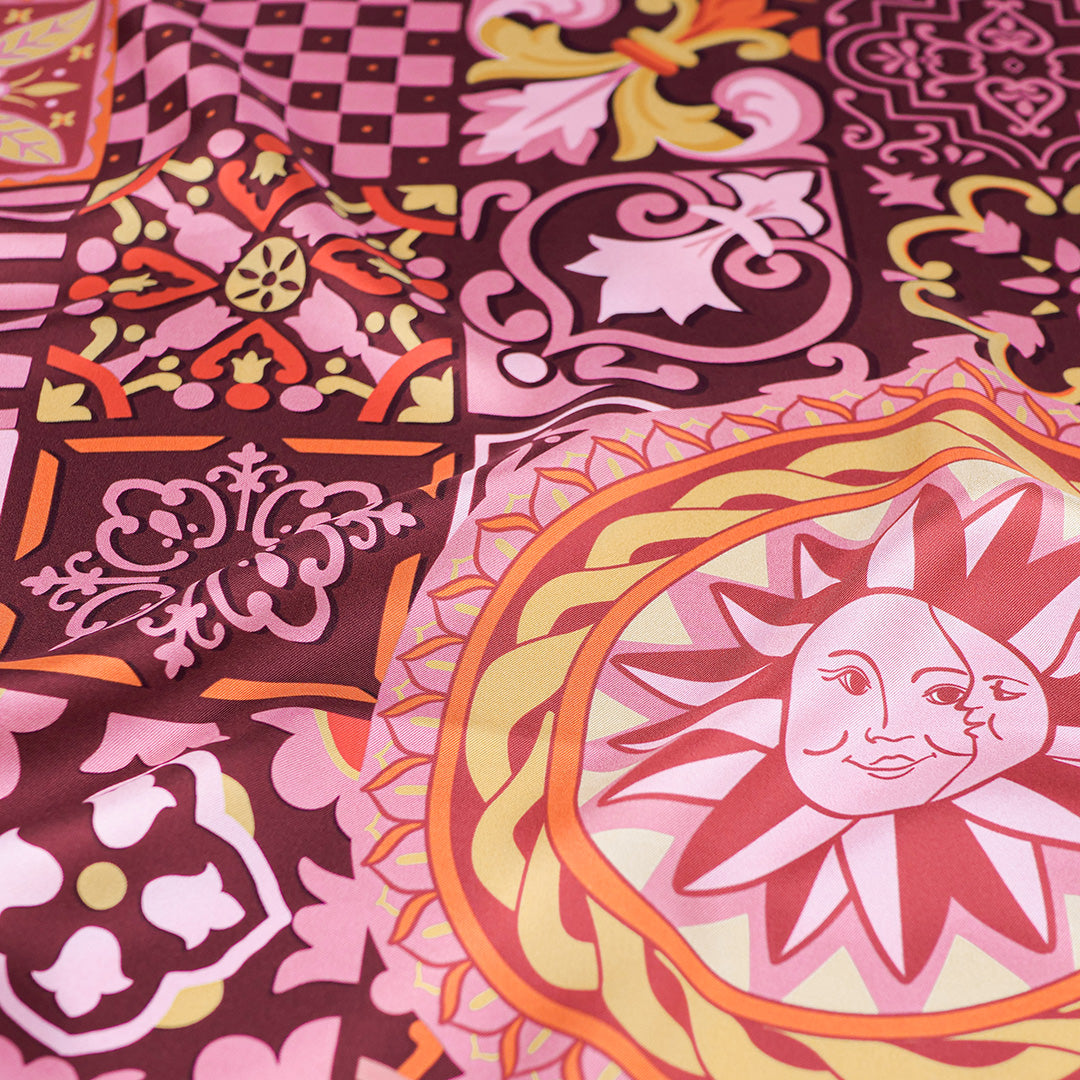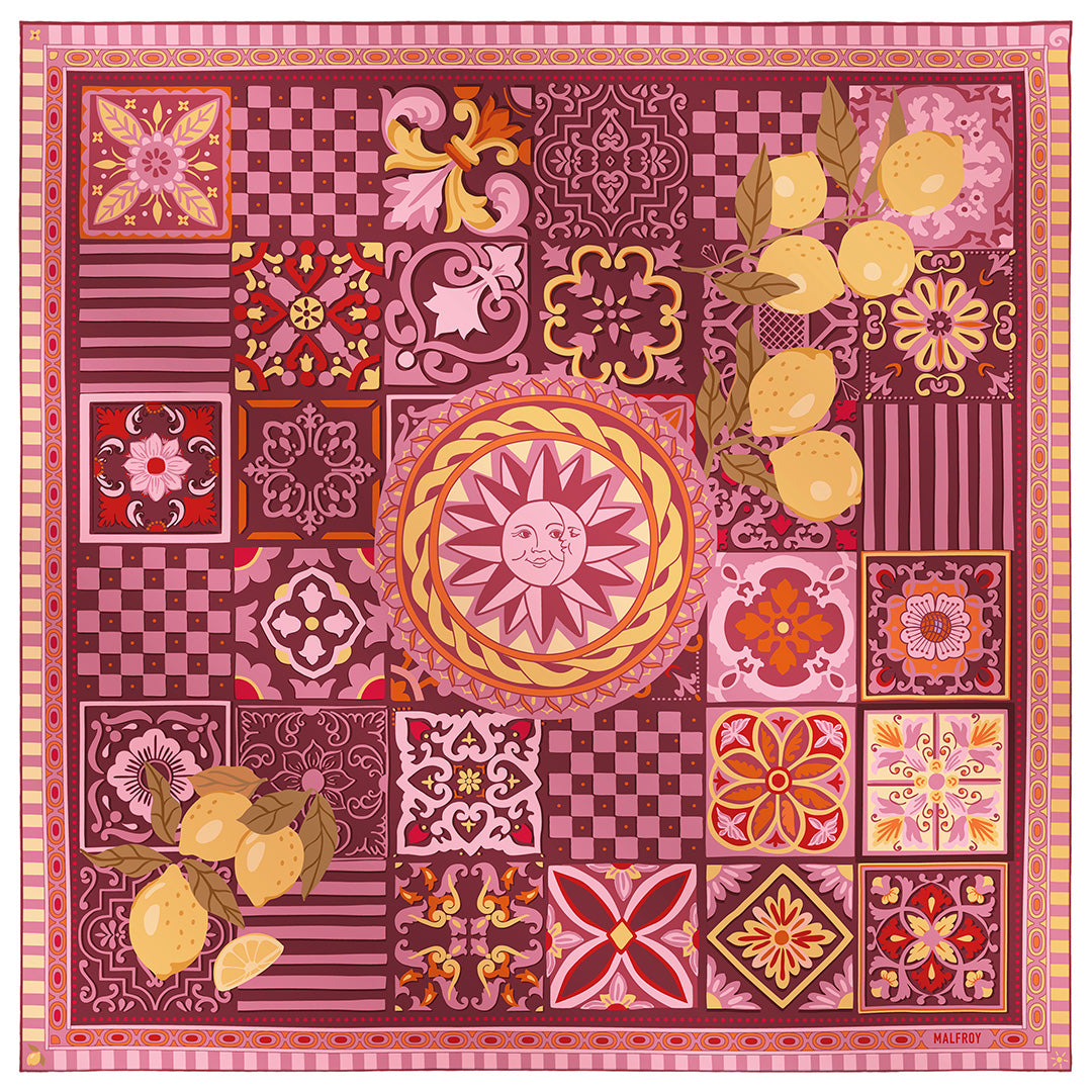 Ce carré de soie s’inspire de la richesse et du raffinement de l’artisanat céramique de la côte amalfitaine. Ce délicat méli-mélo de carreaux aux motifs traditionnels est sublimé par la présence des célèbres citrons de la région, emblèmes de fraîcheur et de lumière. En portant ce carré, vous serez transporté au cœur de la dolce vita italienne, entre douceur de vivre et soleil méditerranéen.