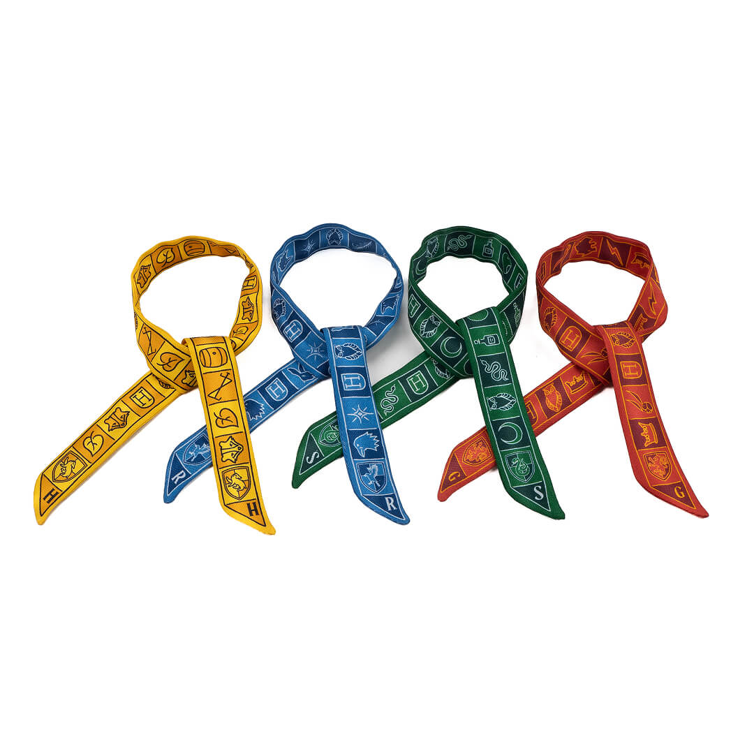 Enfin, le lien en soie Poufsouffle illustre un tonneau, une feuille d’herbologie et l’un des symboles gravés sur la baguette de Cedric Diggory.